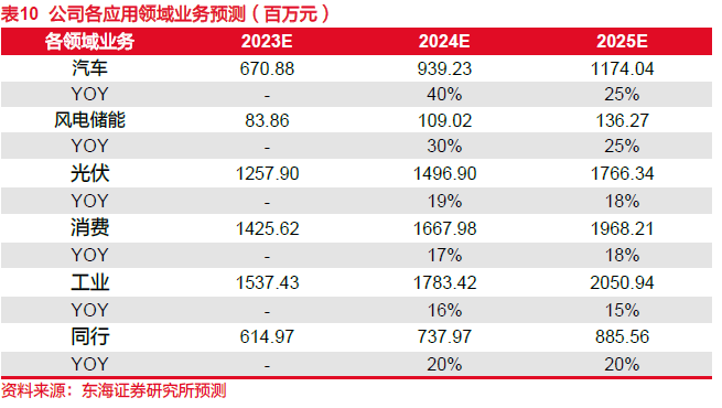 根据下游应用领域我们将公司业务拆分成汽车、风电储能、光伏、消费、工业、同行六大领域业务,2023年占比将分别达到12.0%、1.5%、22.5%、25.5%、27.5%、11%。根据公司2023年公告,汽车电子和清洁能源业务持续高景气,同时公司产品聚焦新能源领域进行开发与突破,并获得大客户订单,未来新能源汽车和新能源发电市场将作为公司主要的增量市场,汽车、风电储能业务将保持高速增长。结合各领域市场未来发展情况,公司2024、2025年汽车业务增速预计为40%和25%,风电储能业务增速预计为30%和25%,光伏由于市场产能大幅上升导致供需关系有所变化,预计增速不及汽车和风电储能,但也保持相对较快增长,2024、2025年光伏业务增速预计分别为19%和18%,随着公司4、5寸晶圆线稼动率提升,消费电子、家电等细分市场回暖,消费行业将有望复苏,2024、2025年增速预计分别保持在17%和18%,工业作为维稳的最大存量市场,2024、2025年增速预计分别保持在16%和15%。