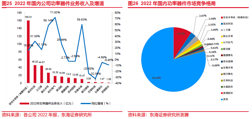 (2)中国功率半导体器件市场中,国内厂商占据不到30%的市场份额,国产化率仍处在较低位,替代空间广阔。2022年国内功率半导体市场中主要13家国产厂商市场份额占比为21%左右,国内龙头公司是闻泰科技旗下的安世半导体,2022年功率半导体营收达160.01亿元,市场份额为9.26%,公司产品覆盖最为全面,基本上涵盖了二极管、MOS、IGBT、SiC等主要产品线,其次为扬杰科技、士兰微、斯达半导、时代电气,2022年功率半导体营收分别为46.22、44.67、26.82、18.35亿元,市场份额分别为2.67%、2.58%、1.55%、1.06%,其中时代电气借助其在轨交领域优势,成为国内高压IGBT龙头,2022年功率半导体营收增速最高,达71.83%。与国外厂商相比,国内厂商的产品结构、技术水平和创新能力仍在存在较大差距,但近年来通过对国际大厂先进技术的持续引进以及自主创新,国内企业已经完成0-1的技术突破,我国厂商在消费级、工业级中低端产品上已经实现了部分国产化,并且在车规级、轨交级高端产品上也有了一定突破。未来随着国内厂商技术水平的提升和管理经验的积累,以及终端客户持续国产替代需求下,目前不足30%的国产化率将有望加速提升。