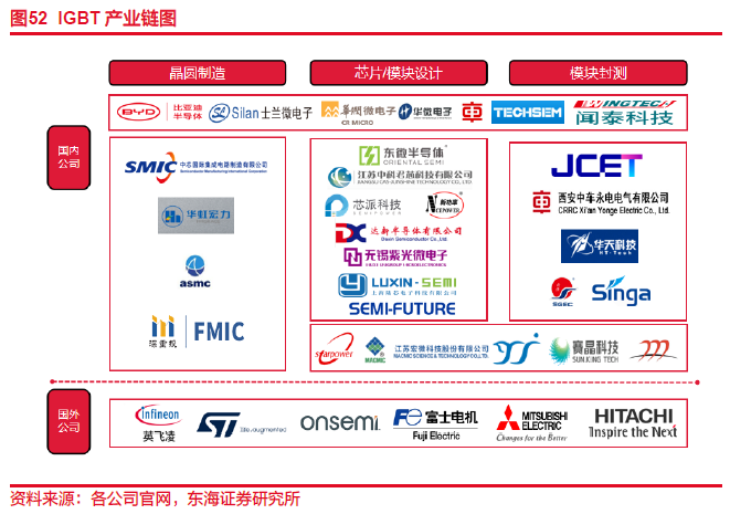 (6)从整个IGBT的产业链来看,核心环节几乎都是海外企业为主,但在每一个产业链环节,我国均有企业在积极布局。海外龙头企业多为IDM模式,如英飞凌、安森美等企业,国内IDM模式的公司较少,绝大多数为上市公司,但在全球市场中占据一定的市场份额,如比亚迪半导、士兰微、中车时代电气等公司。国内主流的芯片生产是采用Fabless的代工模式,典型公司有斯达半导、宏微科技等,而代工厂根据公司提供的工艺流程和设计版图,生产出各项参数符合设计指标的芯片,华虹宏力目前是国内最先进,最全面的半导体功率器件代工厂。