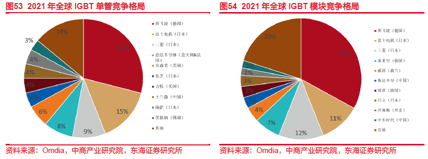 (7)全球IGBT市场呈现出集中度高,海外厂商英飞凌、富士电机、三菱这TOP3大企业占据了超过50%的市场份额。根据Omdia数据,2021年全球IGBT单管市场中,中国大陆企业只有士兰微进入前十大厂商中,占据4%的市场份额;2021年全球IGBT模块市场中,中国大陆只有斯达半导和中车时代进入前十大厂商,分别占据3%和2%。国外巨头英飞凌无论在单管还是模块都处于绝对龙头地位,而国内厂商市场份额较低,且只在某一产品上具备竞争优势。国内厂商和国外厂商存在差距的原因主要是国外厂商成立时间早,比如富士电机成立于1923年,三菱电机成立于1921年,技术积累丰富,同时与海外汽车、工控等大型企业合作十分紧密,在技术与生态上优势显著。国内的几大厂商主要集中在1997—2005年,技术追赶较慢,产业资源十分稀缺,但国内企业已经完成0-1的技术突破,先从消费级、工业级中低端产品入手逐步打开市场,目前已经有一些企业带来车规级高端产品市场,随着国产化不断深入,国内企业未来迎来加速发展期。