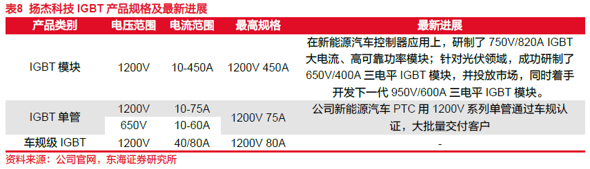 (2)扬杰科技IGBT模块开始批量交付,2023年上半年IGBT营收同比超50%。根据公司2023年半年报,2023年上半年IGBT产品营收同比增长超过50%,目前公司IGBT产品应用领域占比中,在光伏领域具备先天优势和客户资源积累从而占据主导地位,占比约60%~70%,工业占比约20%,汽车占比约10%。2023年以来公司以下游需求为导向获得行业内订单并持续进行产品开发,1)针对新能源汽车领域,公司新能源汽车PTC用1200V系列单管通过车规认证,大批量交付客户;2)在新能源汽车控制器应用上,重点解决了低电感封装、多芯片均流、铜线互连、银烧结等关键技术,研制了750V/820A IGBT、750V400A SiC三相桥大电流、高可靠功率模块;3)针对光伏领域,成功研制了650V/400A三电平IGBT模块,并投放市场,同时着手开发下一代950V/600A三电平IGBT模块。