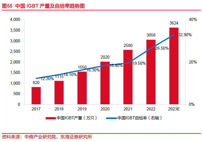(8)国内IGBT产量稳步提升,国产化率长期不断上升。根据中商产业研究院预计,2023年中国IGBT产量有望快速增长达到3624万只,自给率也将达到32.90%,近年来,随着我国IGBT技术的不断更新迭代,国产厂商逐步突破产能受限问题,加速产能布局,目前正处于国产替代的增长阶段。