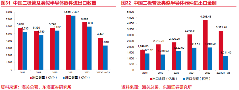 (4)二极管行业是我国功率半导体中发展最早、成熟度最高的市场,国产替代程度已经初有成效。在二极管低端应用市场中,国产替代效应显现,已经基本实现国产替代,而在汽车等高端市场国产替代程度较低,可替代空间较为广阔,二极管在电动汽车的充电桩、电池管理系统、电机控制、汽车照明等方面都起到重要作用,对二极管在高温耐压、高效能等方面要求更高,国产产品替代空间更大。据海关总署统计数据,二极管及类似半导体器件出口/进口数量2022全年为6566/5986亿个,同比下降13.09%/20.15%,2023年前三季度出口/进口数量为4445/3346亿个,同比下降12.60%/29.50%,二极管及类似半导体器件出口/进口金额2022年为4,298.43/1,950.99亿元,同比增长40%/1.72%。从金额同比增速来看,2022年实现出口金额增速显著高于进口金额,从数量同比变化趋势来看,2023年二极管及类似半导体器件出口数量的下降幅度有所收窄,而进口数量的下降幅度仍在扩大,可以看出随着国产厂商不断提升核心竞争力,提高产品性能降低产品成本,二极管市场的国产替代程度持续不断加深,未来在高端领域发力,替代进程有望进一步推进。