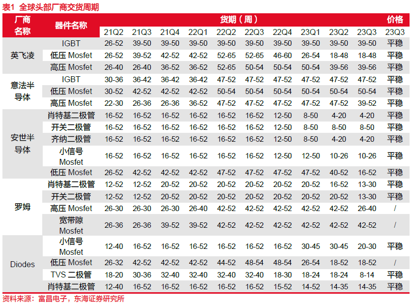 (3)全球半导体周期下行趋势下,短期功率器件全球价格保持相对稳定。2023年第三季度,海外主要厂商交货周期和价格保持平稳态势。1)二极管交货周期方面,罗姆货期为维持在13-30周,国内龙头安世半导体肖特基、齐纳二极管货期维持在4-20周,开关二极管货期维持在8-50周,二极管价格趋势均与2023Q2持平。2)小信号交货周期方面,海外厂商Diodes小信号Mosfet货期维持在20-30周,国内安世半导体货期维持在10-26周,价格趋势也均与2023Q2持平。3)MOSFET和IGBT交货周期方面,英飞凌IGBT货期维持在39-50 周,低压Mosfet货期维持在18-48周,高压Mosfet货期维持在39-56周,意法半导体IGBT货期维持47-52 周,低压Mosfet货期维持在50-54周,高压Mosfet货期维持在39-52周;价格趋势方面,英飞凌与意法半导体均环比持平。现阶段下游需求持续高景气度,而上游海外厂商产能释放有限,功率半导体市场面临短期内供不应求的状态,这为国产企业提供了机遇。如今,本土功率半导体产品性能已经逐渐成熟,且部分产品性能可对标海外大厂产品,加速国产化产品市场渗透,逐步切入高端市场,助力应用新能源车与发电领域的功率半导体市场保持向好态势。