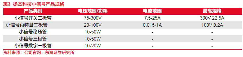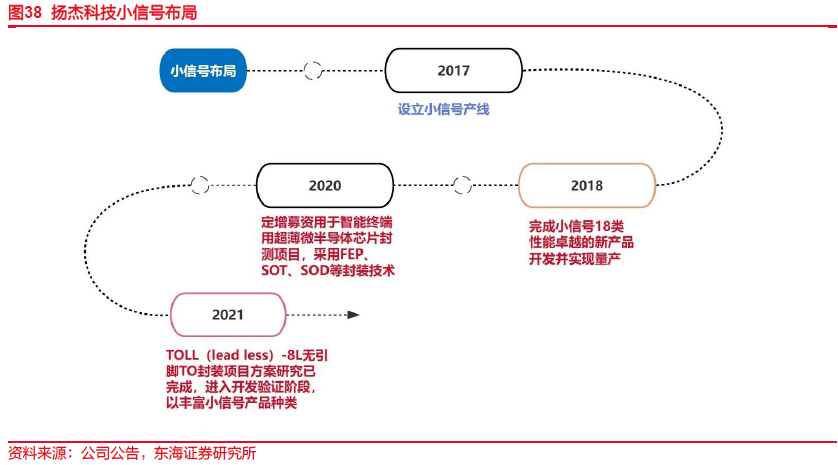 (1)扬杰科技积极布局小信号器件,募资12.9亿元用于封装项目以扩张产能。公司2017年设立小信号产线,2018年成功开发18类性能卓越的新产品并实现量产,2020年定向增发股票将其中12.9亿元募集资金用于智能终端用超薄微半导体芯片封测项目,采用FBP平面凸点式封装、SOT小外形晶体管封装、SOD小外形二级管封装等封装技术,建成投产后智能终端用超薄微功率半导体器件产能达2,000KK/月,可广泛应用于开关电源、变频器、驱动器等电路,作为高频、低压、大电流整流二极管、续流二极管、保护二极管使用,或是在5G通信、微波通信等电路中作为整流二极管、小信号检波二极管使用。2021年公司新增TOLL(lead less)-8L无引脚TO封装项目,开发对标国际领先厂商的TOLL封装产品,以丰富小信号产品种类。