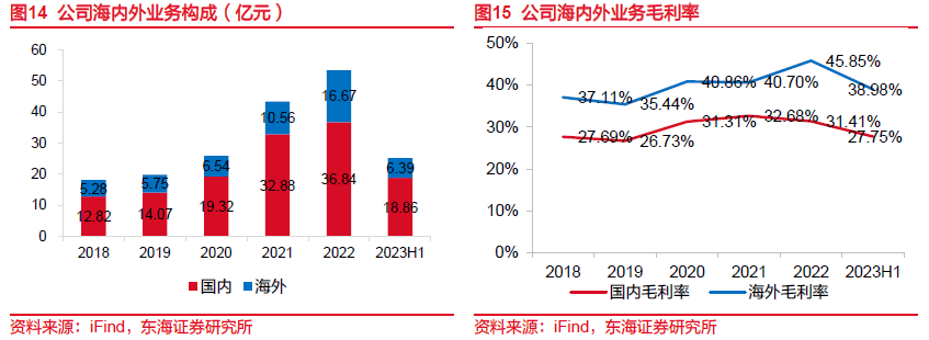 (2)公司海外业务情况有望改善,海外业务毛利率高于国内业务。2022年国内业务实现营收36.84亿元,占比68.17%,而2022年海外业务实现16.67亿元,同比增长占比57.86%,占比为30.85%,与2021年相比提升6.83pcts,2022年公司海外业务高速扩张而海外业务毛利率较高带动公司总体毛利率提升,2023上半年海外业务实现营收6.39亿元,占比为15.81%,占比大幅下降是由于海外处于去库存阶段,目前去库存周期已接近尾声,将于2024年Q1结束,从2024年Q2开始公司海外业务营收表现将有望实现较大改善。未来公司将持续推进国际化战略布局,加强海外市场与国内市场的双向联动。