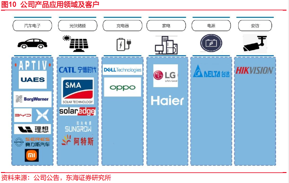 (2)公司产品广泛应用于汽车电子、清洁能源、5G通讯、安防、工业、消费类电子等诸多领域,为客户提供一揽子产品、技术、服务解决方案。公司与国内外各行业TOP客户展开积极合作,目前汽车电子、清洁能源行业需求持续旺盛,汽车电子领域国内客户主要包括比亚迪、小鹏、小米,国外方面,取得安波福、博格华纳、联合电子等客户认证及订单;在光伏储能领域,国内客户包括宁德时代和阳光电源,国外方面与SMA、SOLAREDGE等客户持续扩大合作。