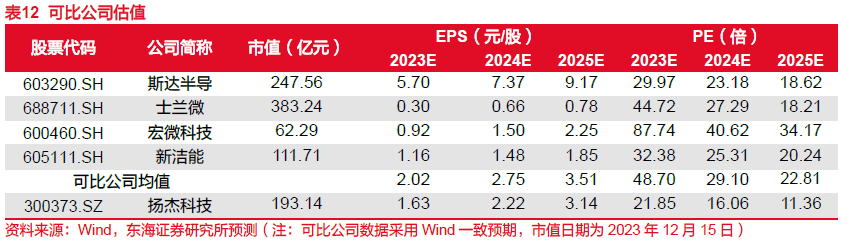 公司作为国内功率器件IDM领先厂商,我们选取A股中四家在业务结构上较为相似的A股领先公司,包括产品覆盖IGBT、MOSFET、IPM、FRD、SiC等的斯达半导,功率器件产品以IGBT和MOSFET为主的IDM厂商士兰微,主营业务为IGBT和FRED的宏微科技,主营IGBT、MOSFET以及IPM的新洁能。四家可比公司2023-2025年Wind一致预期下PE均值分别为48.7、29.1、22.8倍,考虑到公司聚焦于新能源领域拓展产品品类,逐步扩张产能建设,海外业务有望回暖,2023-2025年营收有望持续增长,而公司当前估值水平显著低于可比公司均值,应当享受更高的估值溢价。