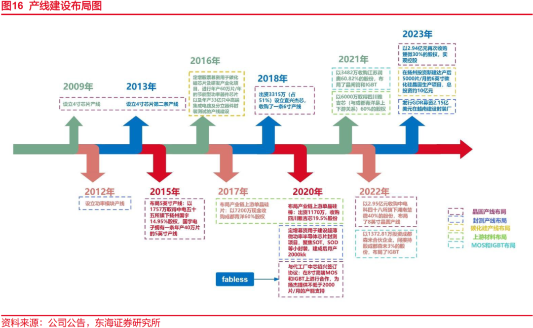 器件端封测产线布局方面,2012年设立功率模块产线,2020年定向增发募资建设超薄微功率半导体芯片封测项目,主要进行SOT、SOD等小封装,建成后月产达2000kk,2023年成功发行GDR募资建设越南封装厂,满足海外客户需求。