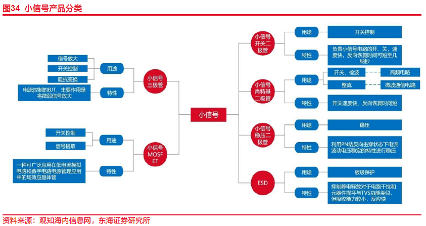 (1)小信号器件具有小电流、低功率的特点。小信号器件,又称小功率半导体器件,是指额定电流低于1A或额定功率低于1W的半导体分立器件。小信号器件主要可分为两大类:小信号二极管、小信号三极管,按照芯片结构和功能不同,小信号二极管可以进一步细分为小信号开关二极管、小信号肖特基二极管、小信号稳压二极管、ESD(Electro-Static discharge,释放静电),小信号三极管可以进一步细分为普通小信号三极管、小信号MOSFET。小信号器件主要功能有开关、续流、建波、稳压、ESD等,由于额定电流低主要在二次电源对电路中各并联功能模块的供电过程中使用。