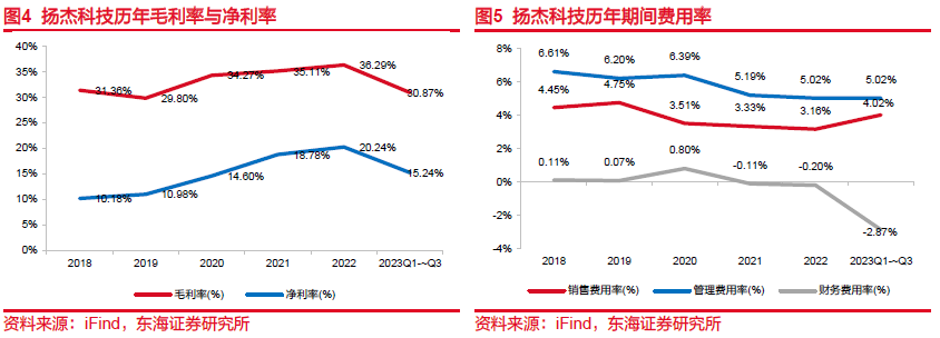 (3)盈利水平稳中有升,期间费用持续优化。公司2022年毛利率和净利率分别增至36.29%和20.24%,同比上升1.18pcts和1.46pcts,盈利能力稳定,2022年销售、管理、财务费用率分别降至3.16%、5.02%、-0.20%,费用管控能力实现进一步提高。2023年前三季度盈利水平短期承压,降至30.87%和15.24%,主要是由于利润率更高的海外市场营收占比降低以及毛利率较低的产品同比增长幅度相对较大,占比增加导致整体毛利率有所下滑;2023Q3毛利率为32.28%,同比下降2.90pcts,环比提高2.76pcts,毛利环比有所回升主要是受益于公司稼动率提升显著以及汽车电子等高毛利率业务实现快速增长。未来随着海外业务复苏,公司毛利率有望持续改善以逐步提升。
