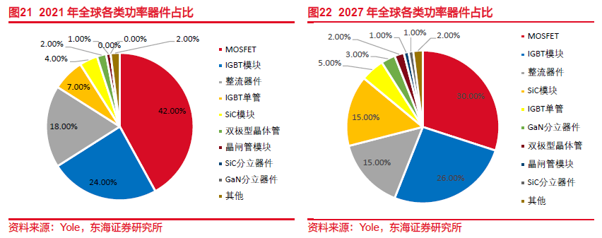 (4)2021年全球功率器件中主要以MOSFET和IGBT这两类器件为主,2027年这两类器件仍占据主导地位,SiC、GaN等第三代半导体占比有望从4%提升至19%。根据Yole数据,在2021年全球功率半导体市场中MOSFET分立器件占比最大为42%,IGBT模块、单管占比分别为24%和7%,这两类器件占据主要地位,广泛应用于电动汽车和充电桩等领域。2027年IGBT模块、单管占比分别为26%、5%,仍然保持在31%,成为占比最大的细分市场,MOSFET占比为30%,而SiC模块、分立器件、GaN分立器件占比分别为15%、1%和3%,第三代半导体在性能优势下发展迅速合计占比有望提升至19%。