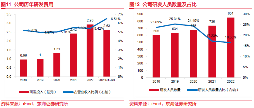 (3)公司持续加码研发投入,进行技术积累以加快更新迭代。2022年公司研发投入达到2.93亿元,同比增长21.07%,2023年前三季度公司研发投入达到2.63亿元,研发费用率从2022年的5.42%增长至6.51%,研发人员数量从2018年的605人逐年增长至2022年851人。公司近三年研发投入快速增长进入高峰期,公司技术方面正处于突破性进程中,目前公司拥有SiC研发团队、GaN研发团队、IGBT研发团队、MOSFET研发团队、二三极管芯片研发团队、Clip封装研发团队、WB封装研发团队、8寸晶圆长沙研发团队、IGBT日本研发团队、MOSFET台湾研发团队、单晶硅成都研发团队。公司建立了覆盖芯片、封装、应用的仿真平台,健全了产品参数的测试中心,完善了新能源、汽车电子应用平台的构建,形成了从晶圆设计研发到封装产品研发,从硅基到第三代半导体研发从售前技术支持到售后技术服务的完备的研发及技术服务体系,为公司新品开发、技术瓶颈突破、扩展市场版图等提供了强有力的保障。