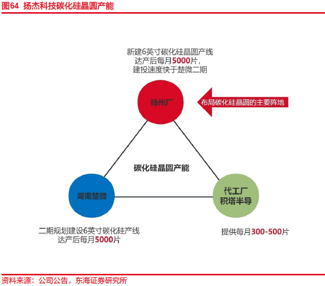 (2)公司推进SiC芯片产线建设,产能供应有望突破1万片/月。2022年4月,扬杰科技斥资2.95亿收购中电科四十八所旗下湖南楚微40%股份,楚微对应估值7.375亿,截至2021年底,楚微净资产6.51亿,营收2655万,净利润1433万(包含政府的1.1亿补贴),对应PB1.13,2023年3月又以2.94亿再次收购了楚微30%的股权,实现对楚微的控股,成为子公司纳入合并报表,楚微二期规划建设6寸碳化硅产线,达产后产能5000片/月。2023年4月与扬州市邗江区政府签署《6英寸碳化硅晶圆项目进园框架合同》,拟在当地投资新建6英寸碳化硅晶圆生产线项目,总投资约10亿元,分两期实施建设,全部建成投产后,形成碳化硅6英寸晶圆产能5000片/月,扬州厂是公司布局碳化硅晶圆产能的主要阵地,建设投产速度将快于楚微二期碳化硅产线。此外,公司目前在上游代工厂积塔半导体获得碳化硅晶圆产能为300-500片/月。