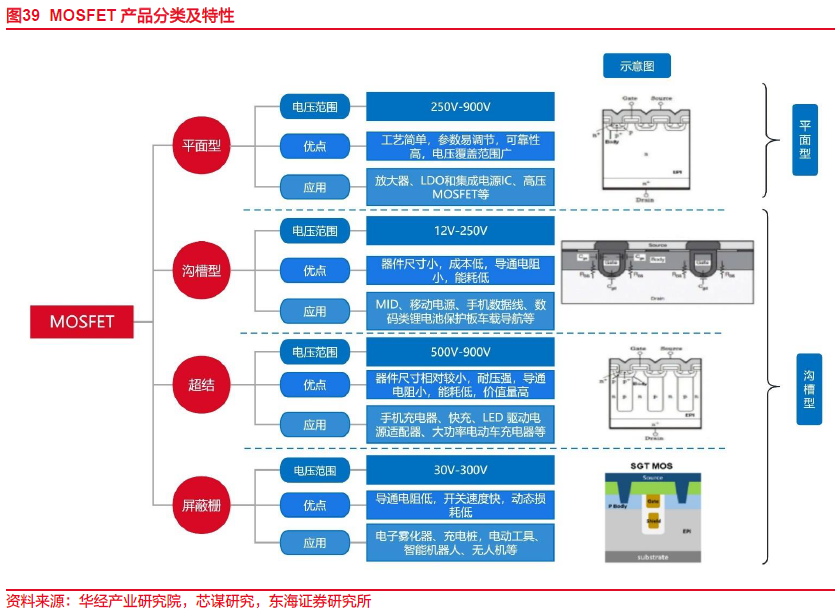 (1)MOSFET全称金属氧化物半导体场效应管,是电压型控制器件,通过栅极电压的变化来控制输出电流的大小,并实现开通和关断。MOSFET具有驱动电路简单,驱动功率小,开关速度快,工作频率高等特点,是功率半导体重要的基础元器件。随着沟道结构的不断演变,MOSFET可细分为平面型、沟槽型、屏蔽栅和超结功率MOSFET,平面型MOSFET电压覆盖范围广,适用于250-900V,应用领域众多;Trench(沟槽型)MOSFET主要用于低压领域,适用于12V-250V,在移动电源、手机数据线等场景中应用;SGT(屏蔽栅沟槽)MOSFET在传统沟槽MOSFET器件PN结垂直耗尽的基础上引入了水平耗尽获得更高的击穿电压,主要用于中压和低压领域,适用于30V-300V,在充电桩、智能机器人、无人机等场景中应用;SJ-(超结)MOSFET打破了硅材料极限,大幅降低了器件的导通电阻和开关损耗,主要在高压领域应用,适用于500V-900V,在LED驱动电源适配器、大功率电动车充电器等场景中应用。