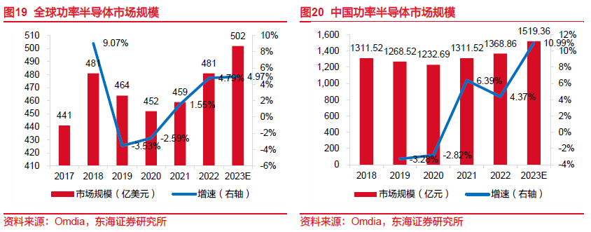 (3)全球及中国功率半导体市场规模将在2023年有望分别增长至502亿美元和1519.36亿元,2020-2023年CAGR达3.56%和7.22%,预计长期保持增长,未来几年年均复合增速保持在4%和8%左右。根据Omdia数据显示,从2021年起半导体市场局面扭转重启增长,2022年全球及中国功率半导体市场规模分别为481亿美元和1368.86亿元(191亿美元),同比增长4.79%和4.37%,2023年全球功率半导体市场规模有望继续增长至502亿美元,2023年中国功率半导体市场规模将较大幅增长至1519.36亿元,同比增速达10.99%,达到历史新高,2020-2023年CAGR预计分别为3.56%和7.22%。
