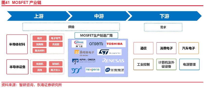 (3)从MOSFET产业链来看,上游包括半导体材料和设备,中游为MOSFET生产制造商,下游终端应用需求领域广泛。上游半导体材料包括硅片、电子特气、光掩模、光刻胶和半导体设备包括光刻机、刻蚀机、清洗和离子注入等;中游制造企业包含IDM以及Fabless模式等厂商,海外包括英飞凌、安森美、东芝等欧美日国际巨头,国内企业以华润微电子为代表;MOSFET驱动简单且高效的性能优势明显,下游应用领域众多,包含通信、消费电子、汽车电子、工业控制、计算机、电源管理等。
