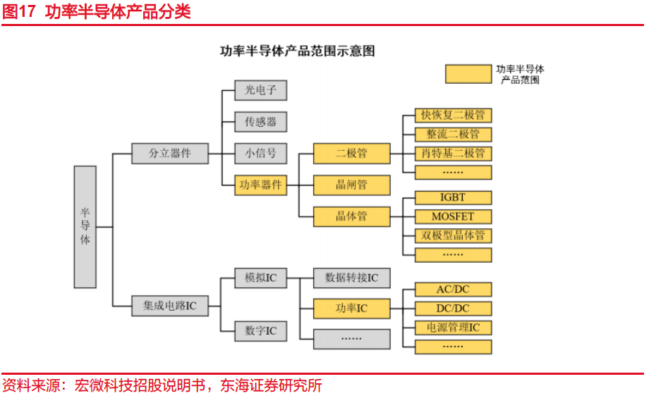 (1)功率半导体根据集成度可以分为分立器件中的功率器件和集成电路IC中的功率IC两个大类。半导体产品的分类是一个十分复杂困难的过程,国际上多种分类方法都不可能完美区分出来各种产品种类与规模,目前较多采用WSTS(世界半导体贸易协会)的分类方法。在下图的半导体产品中,功率半导体是包含了功率器件与功率IC两大类,功率IC相对来说集成芯片的小功率、小电压产品,功率IC集成度较高,是指将高压功率器件与其控制电路、外围接口电路及保护电路等集成在同一芯片的集成电路,主要应用于手机等小电压产品。功率器件包括二极管、晶体管和晶闸管三大类,其中晶体管市场规模最大,晶体管又细分为IGBT、MOSFET、双极型晶体管(BJT)等。功率器件是指体积较大,用来处理较大功率、大电压的产品。