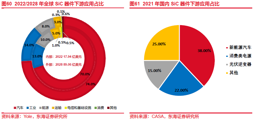 (5)汽车市场是全球SiC功率器件市场中的第一大应用市场,2028年占比有望从2022年的70%提高至74%,在国内新能源汽车也是高增长下游市场,2021年占比为38%。根据Yole报告中数据,2028年碳化硅功率器件市场规模有望达89.06亿美元,汽车、工业、能源成为全球碳化硅功率器件市场的主要的三大应用市场,其中汽车市场主导整个应用市场,2028年下游占比将从2022年的70%提升至74%,这主要受益于新能源汽车的高速发展推动,由于碳化硅耐高压的优势性能,在800V电动汽车和DC充电器中的应用成为SiC器件高增的关键驱动因素,工业市场是第二大市场,占比提升幅度较小,将从2022年的13%提升至2028年的14%,是下游最重要的存量市场,能源市场也为碳化硅的发展贡献了相对较大的力量,2028年占比将达到8%,主要是受光伏和风电等装机量的增长驱动,其他领域占比较小,包括运输、消费、通讯和基础设施等。国内碳化硅器件市场主要是受新能源汽车、消费类电源、光伏逆变器这三大领域驱动,根据CASA数据,2021年占比分别为38%、22%、15%,新能源汽车市场景气持续,消费电子持续复苏,光伏等新能源发展快速,未来市场规模有望继续高增长。