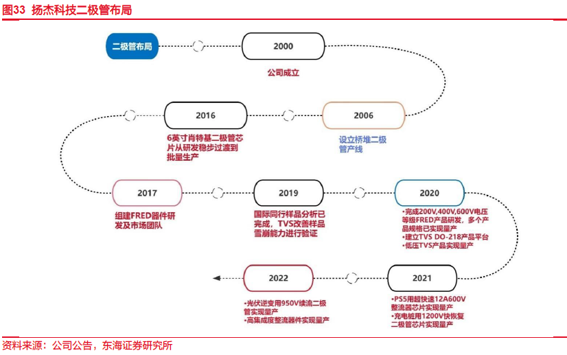 (1)扬杰科技是国内二极管市场龙头,扎根二极管领域逐渐发展壮大。根据芯谋研究数据,2019年扬杰科技在功率二极管市场中国排名第一,全球第四,国内市占率为13.5%,在二极管整流桥细分领域全球市占率高达20.5%,成为全球第一,在整流快恢复二极管、肖特基二极管、TVS细分领域中表现也较好,全球市占率分别为4.0%、6.3%、5.7%,在光伏二极管领域市占率和产能均全球第一。在投资者互动平台,公司表示在光伏接线盒旁路二极管领域的市场占有率已超过30%。根据公司2023年半年报,2023年上半年光伏二极管业务同比增长20%以上。公司2006年正式设立扬杰科技,自建桥堆二极管产线,2008年设立4英寸产线主攻光伏二极管成为IDM光伏二极管厂商后逐步扩大业务范围。之后公司继续在光伏二极管产品类型上进行突破,2022年公司使用950V快速恢复二极管(FRD)芯片的光伏逆变用950V续流二极管产品实现批量生产,高集成整流器件也实现批量生产。