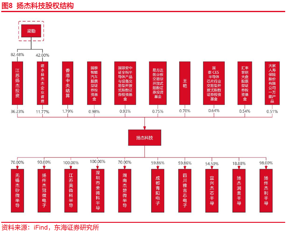 (5)扬杰科技实控人为梁勤女士,从事电子元器件制造业务的重要子公司共5家。股权结构来看,截止2023年9月30日,江苏扬杰投资有限公司、建水县杰杰企业管理有限公司为公司前二大股东,分别持有公司36.23%和11.77%的股份,梁勤女士是上述这两家公司的最大股东,分别持有82.48%和42%的股份,间接成为公司实控人,同时担任公司董事长。公司纳入合并财务报表范围共28家公司,其中6家重要非全资子公司均从事电子元器件制造业务,包括成都青洋电子、扬杰润奥半导、四川雅吉芯电子、湖南楚微半导,以上公司均以收购方式取得;另外2家宜兴杰芯半导、扬州杰利半导,则是分别于2018年和2009年出资设立。