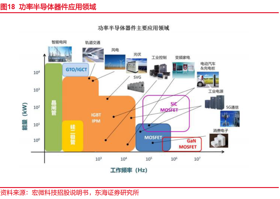 (2)功率半导体的两大功能是开关与电能转换,主要可以依据工作频率与功率大小将功率半导体分为不同类型。功率器件通过调节改变电子元器件的功率来实现电源开关和电能转换的功能,主要体现在变频、整流、变压、开关等方面。其应用范围广泛,包括工控、风电、光伏、电动汽车与充电桩、轨交、消费电子以及5G通信等领域,其中IGBT、MOSFET、SiC、GaN功率器件由于工作频率更高,耐高压性能更优,因而应用领域更广,更适用于电动汽车、充电桩、工业电源、轨道交通等高压和工作环境更为复杂情况的工作场景。