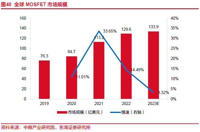 (2)MOSFET行业发展前景广阔,全球市场规模有望在2023年达到133.9亿美元。MOSFET器件应用广泛,规模也较为可观,是功率半导体中非常重要的细分领域。根据中商产业研究院数据,2022年全球MOSFET市场规模达到129.6亿美元,2019-2022年均复合增速CAGR为19.31%,保持较高速增长态势,2023年有望继续增长达到133.9亿美元。