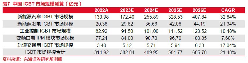 (4)受益于新能源汽车和新能源发电的需求大幅增加,中国IGBT市场规模将持续增长,根据之前IGBT行业深度报告测算,到2026年,中国IGBT市场规模将有望达到685.78亿人民币,年复合增长率达21.48%。在各下游市场中,新能源汽车市场依然是增速最快的部分,其市场规模2022-2026年复合增速高达32.84%;而新能源发电市场也将获得21.34%的行业增速,成为第二大增速较高的领域;轨道交通市场的增速也相对较快达17.04%,由于其体量较小,对IGBT市场规模扩张提供的贡献相对较小,但仍然是具有良好发展前景的应用领域;工控市场发展较为成熟,波动较小成为下游市场稳健支撑,工控IGBT市场规模保持稳定增长;变频白电虽然增速最低,但其体量大、应用渗透率高,也是不可或缺的重要助力。