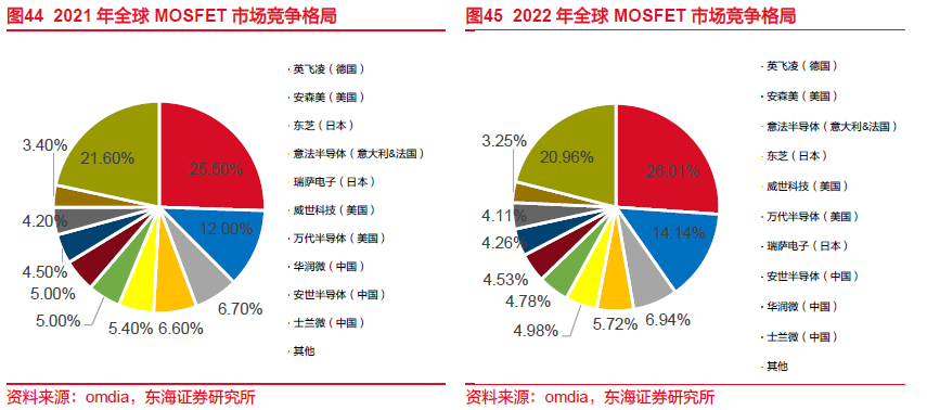 (5)2022年全球MOSFET市场中前五大厂商占有超过50%的市场份额,以海外企业为主体,国内企业有3家企业进入TOP10行列。根据omdia数据,在全球MOSFET市场中,2022年TOP10厂商与2021年相同,排名次序稍有变化,但英飞凌和安森美一直稳居龙头地位,其中英飞凌处于绝对主导地位,MOSFET营收远超第二名安森美,前五大厂商均为具有先发优势和技术优势的海外企业,2021年和2022年CR5分别为56.20%和57.79%,集中度较高,国内主要是闻泰科技旗下的安世半导体、华润微电子、士兰微3家企业上榜,2022年安世半导体以4.26%的市占率超过华润微成为国内MOSFET市场第一,3家企业2021年和2022年市场份额总计均不超过12%,随着未来国产替代程度加深,核心竞争力提高,国内企业在全球范围内有望占据更大的市场份额。