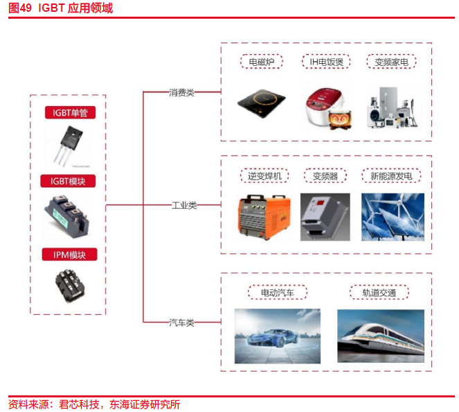 (3)IGBT应用范围按照领域的不同主要可以分为三大类:消费类,工业类,汽车类。IGBT单管主要应用于小功率家用电器、分布式光伏逆变器;IGBT模块主要应用于大功率工业变频器、电焊机、新能源汽车(电机控制器、车载空调、充电桩)等领域;而IPM模块应用于变频空调、变频冰箱等白色家电产品。