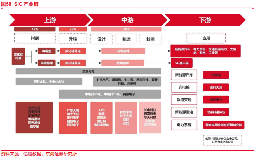 (3)在碳化硅器件的成本结构中,上游中的衬底占比47%,是价值量最大的环节。SiC产业链上游是衬底和外延,中游是器件的设计、制造和封测环节,下游是终端应用,碳化硅产业链价值量集中于上游,成本占比为70%,其中衬底占比47%,价值量最大,也是最重要的环节,衬底的性质决定器件的最终应用领域,根据所生长外延片的不同,碳化硅衬底可分为导电型和半绝缘型,导电型衬底的外延是碳化硅,主要用于制造耐高温、耐高压的功率器件,广泛应用于新能源汽车、光伏新能源发电、电力系统、轨道交通等领域,而半绝缘型衬底的外延是氮化镓,主要用于制造微波射频器件,应用于5G通信、国防军工等领域。国内上游中游全布局的企业仅有三安光电,布局上游衬底的公司以天科合达和天岳先进为主,布局中游的IDM厂商包括时代电气、华润微、扬杰科技等,晶圆制造的foudary厂商主要是以积塔半导为代表,封测厂商主要包括长电科技、通富微电等。