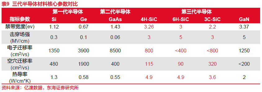 (2)相较于第一、二代半导体材料,碳化硅材料禁带宽度更大、热导率和击穿场强更高,在高温、高压、高频、大功率电子器件领域优势显著。半导体材料历经了三代发展,第一代半导体以硅、锗为代表,带动以集成电路为核心的微电子产业的快速发展,第二代半导体材料以砷化镓为代表,具有较好的电子迁移率和带隙,在卫星通讯等领域广泛应用,第三代半导体以碳化硅、氮化镓为代表,在高温、高耐压以及承受大电流等方面更具优势。相比于传统硅基材料,SiC的禁带宽度在2.2~3.26ev之间,是硅的3倍左右,击穿场强在3~5MV/cm之间,是硅的8-10倍,能承受更大的电流和电压,具有耐高压特性,热导率在3.6~4.9W/cm*K之间,是硅的4-5倍,能在更高温度下工作,具有耐高温特性。因此碳化硅器件在高温、高压、大功率电子器件和航天、军工等极端应用领域中具有不可替代的优势。此外,碳化硅基模块集成度更高,可以缩小模块体积50%以上,从而消减功率损耗,降低综合成本。