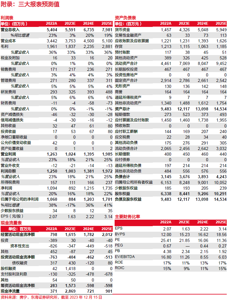 首次覆盖,给予“买入”评级。随着新产品持续放量,海外业务增长,各产线产能释放,我们认为公司业绩将会重启增长态势。预计公司2023-2025年营业收入分别为55.91、67.35、79.81亿元,同比增速分别为3.46%、20.46%、18.51%;归母净利润分别为8.84、12.03、17.01亿元,同比增速分别为-16.64%、36.11%、41.37%。首次覆盖,给予“买入”评级。