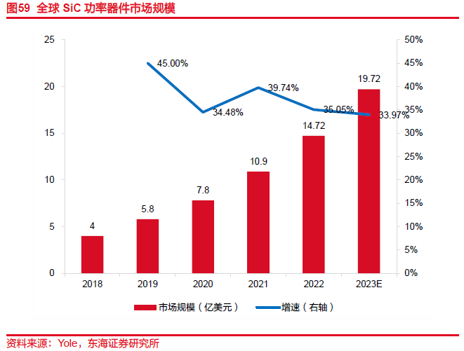 (4)全球SiC功率器件市场规模高速增长,有望在2023年达到19.72亿美元。碳化硅功率器件优势显著,近年来步入快速发展期,根据Yole数据,2022年全球碳化硅功率器件市场规模为14.72亿美元,2019-2022年CAGR高达36.40%,随着技术突破和成本下降,在电动汽车、充电桩、光伏新能源等高增长领域中的应用规模有望继续高速扩张,2023年全球碳化硅功率器件市场规模将增长至19.72亿美元,同比增速达33.97%,成为功率半导体中增速最高的细分产品。