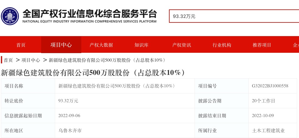 9月6日消息,据全国产权交易平台,新疆绿色建筑股份有限公司500万股股份(占总股本10%)挂牌转让,底价93.32万元。披露结束日期为2022年10月9日。转让方为中铁装配式建筑股份有限公司。