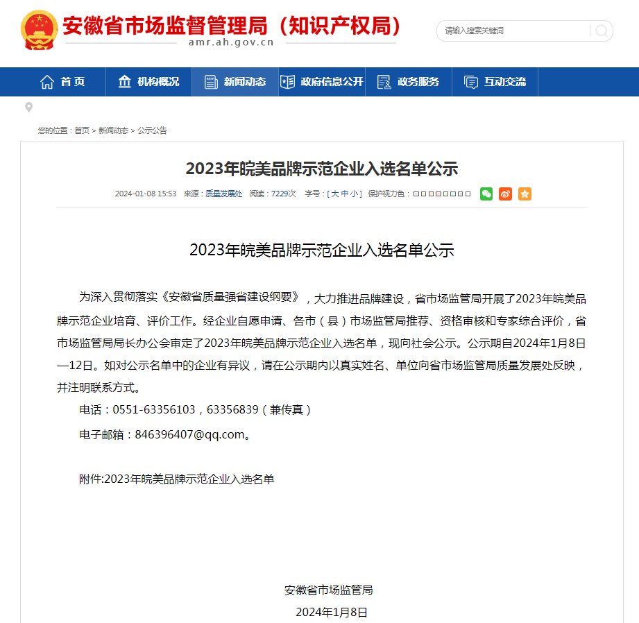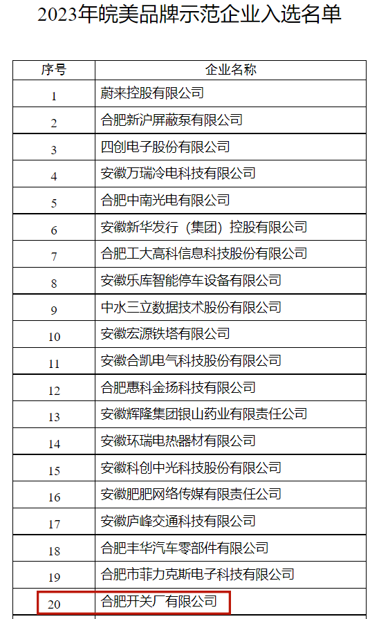 近日,安徽省市场监管局公布2023年“皖美品牌示范企业”入选名单,经综合评价,易事特集团参股企业合肥开关厂成功入选!