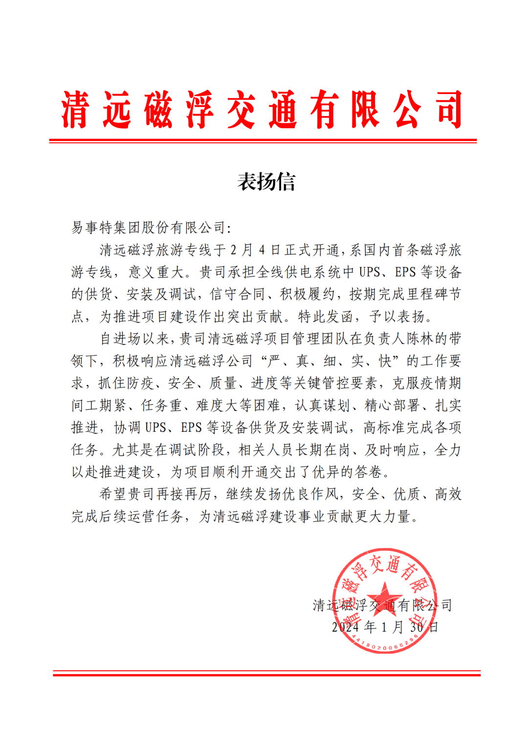 近日,易事特集团收到了清远磁浮交通有限公司发来的感谢信。信中,对易事特信守合同、积极履约,按期完成里程碑节点,为清远磁浮旅游专线顺利通车所作出的突出贡献,予以高度评价,并致专函表示感谢。