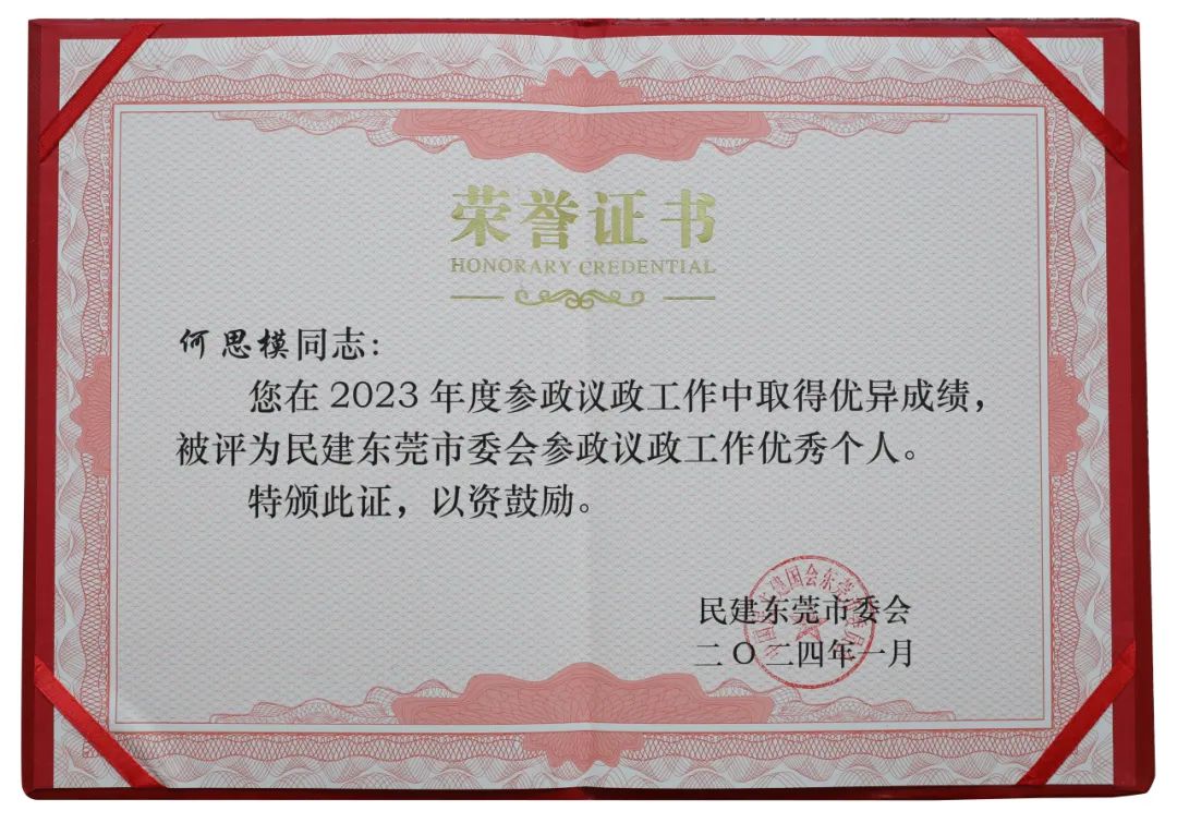 作为一名民建老会员,何思模教授始终铭记参政议政初心使命和责任担当,积极践行参政议政责任和义务,通过各种途径,积极提交提案或社情民意信息。2021年他提交的《关于支持传统企业打造核心竞争力向数字化转型升级的建议》提案被列为东莞市《关于推动我市数字经济高质量发展》系列提案之一。
