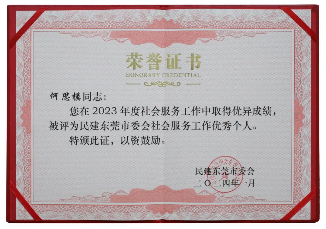 “此次获得民建东莞市委会表彰,既是对本人工作的肯定和鼓励,更是一种鞭策和激励。新的一年新的开始,我将继续努力,发挥一名老民建的作用,尽职尽责,为东莞市经济社会发展和民生保障事业贡献才智和力量。”何思模教授说。