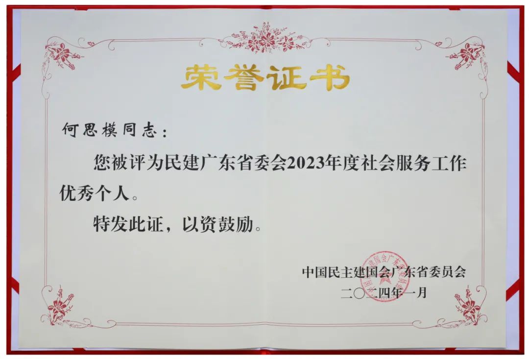 近日,根据《民建广东省委会社会服务工作表彰办法》要求,经综合评选,主委会议审议通过,易事特集团创始人何思模教授再次获评民建广东省委会2023年度社会服务工作优秀个人。