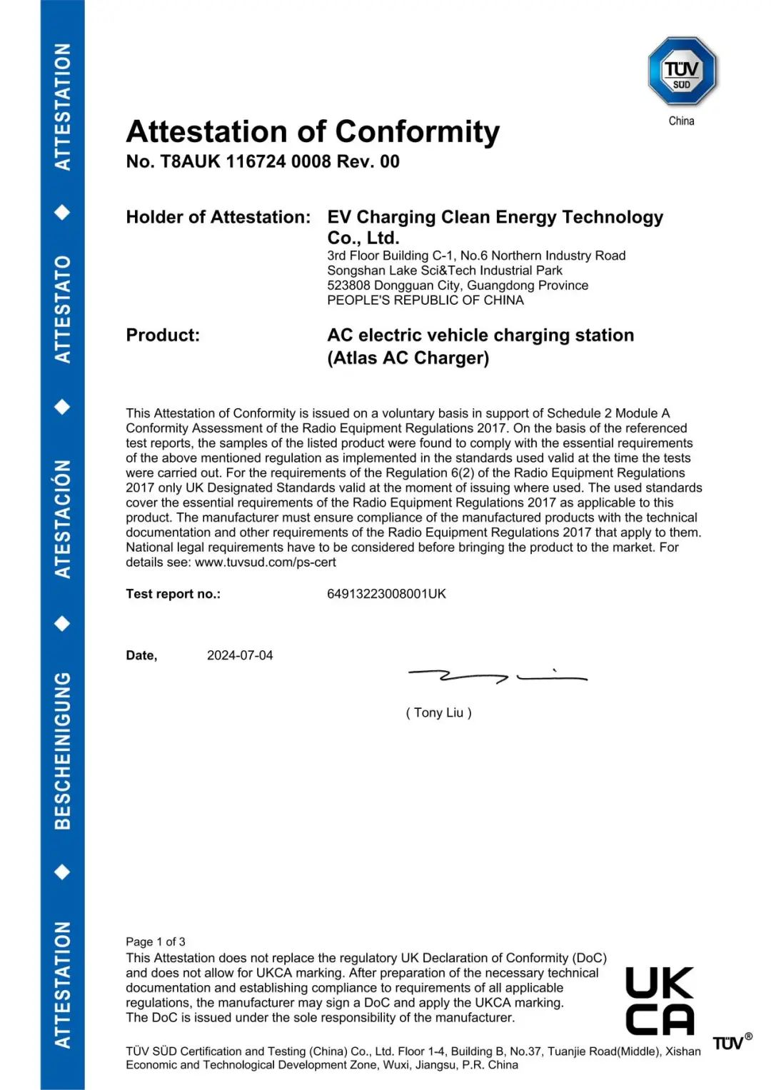 在此次项目认证中,TüV南德按照UKCA技术规范标准,对易事特中能易电Atlas系列7kW/11kW户用版和7kW/11kW/22kW运营版交流桩产品进行了严格完整的测试。相关产品均顺利通过各项检测,并最终获得UKCA证书。这标志着易事特中能易电充电设备满足英国市场的准入标准,获得了竞争国际市场的通行证。