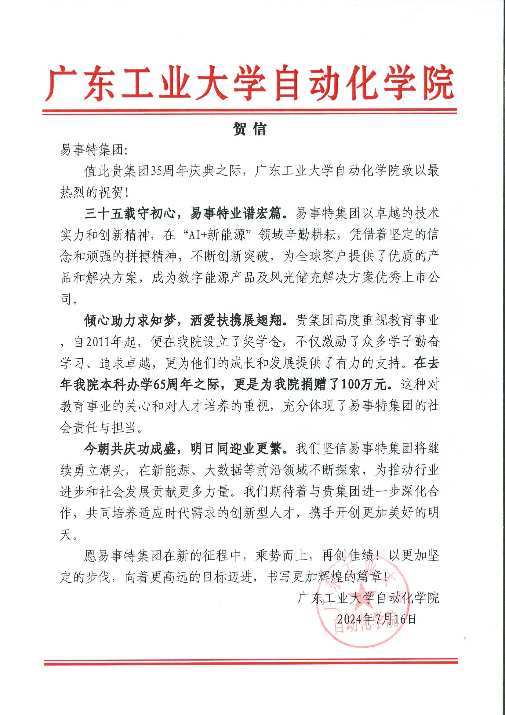 衷心感广东工业大学对易事特集团的真挚祝福与支持。易事特高度重视教育事业,自2011年起便在该校自动化学院设立了奖学金,13年来激励了众多学子勤奋学习、追求卓越,更为他们的成长和发展提供了有力的支持。尤值一提的是,2023年在该院本科办学65周年之际,更是捐赠了100万元,助力其科学研究及人才培养,充分体现了易事特集团的社会责任与担当。
