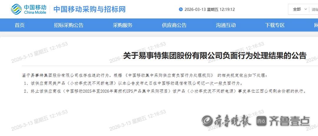 近日,中国移动采购与招标网发布关于易事特集团股份有限公司负面行为处理结果的公告。