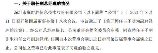 挖贝网8月12日,赢时胜(300377)(300377)于2021年8月11日召开第四届董事会第十八次会议,审议通过了《关于聘任王圣明为副总经理的议案》,经公司总经理提名,公司董事会提名委员会审核,同意聘任王圣明担任公司副总经理,任期自本次董事会通过之日起至第四届董事会届满之日止。公司独立董事已对此事发表了同意的独立意见。