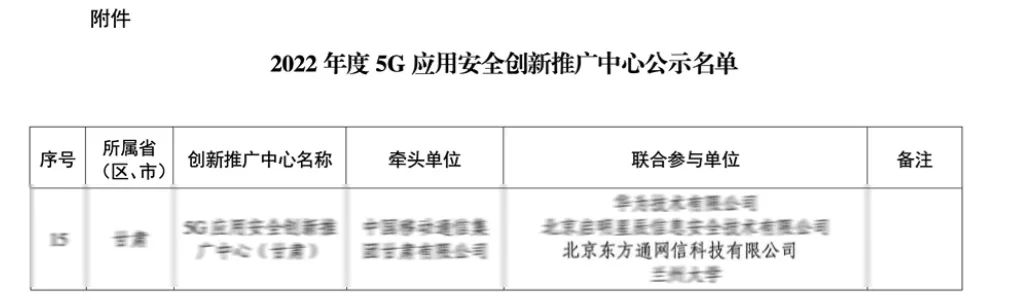 近日,工信部发布《2022年度5G应用安全创新推广中心名单》公示,东方通作为联合参与单位,将与甘肃移动共同成立“5G应用安全创新推广中心(甘肃)”。