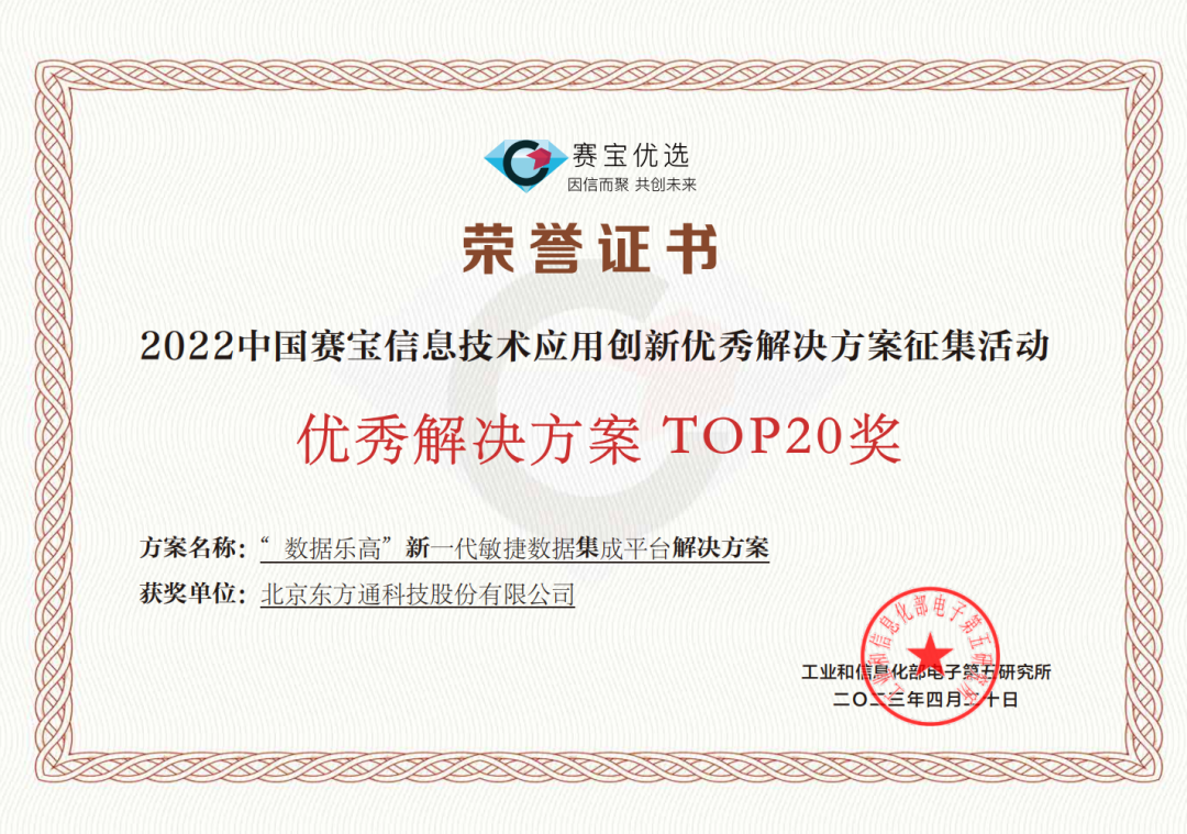 近期,中国赛宝信创生态合作伙伴大会暨赛宝优选信创优秀解决方案颁奖仪式,在北京亦庄信创园成功举办。东方通的“‘数据乐高’新一代敏捷数据集成平台解决方案”从千余个参评方案中脱颖而出,荣获“中国赛宝信创优秀解决方案TOP20奖”。
