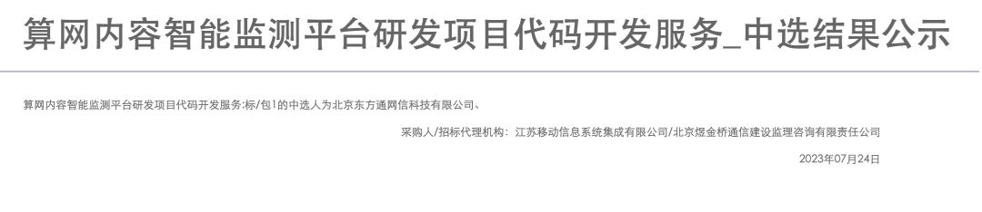 近期,东方通成功中标算网内容智能监测平台研发项目代码开发服务项目,凭借在智能内容监测、反诈等领域的技术积累及项目经验,将帮助江苏移动提升算网内容集中治理的工作成效,全面保障算网内容安全。