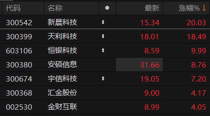 8月9日,金融科技股表现活跃。13时49分,新晨科技20cm涨停,天利科技涨超18%,恒银科技涨停。安硕信息拉升涨超8%,午后涨幅一度超过14%。