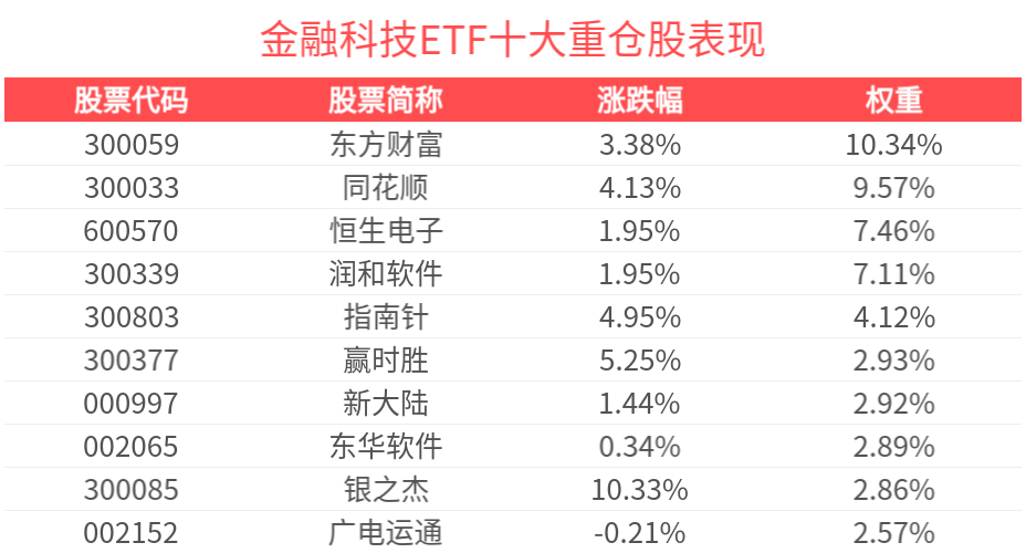 数据显示,截至2025年2月28日,中证金融科技主题指数(930986)前十大权重股分别为同花顺(300033)、东方财富(300059)、恒生电子(600570)、润和软件(300339)、东华软件(002065)、指南针(300803)、新大陆(000997)、赢时胜(300377)、广电运通(002152)、银之杰(300085),前十大权重股合计占比53.94%。