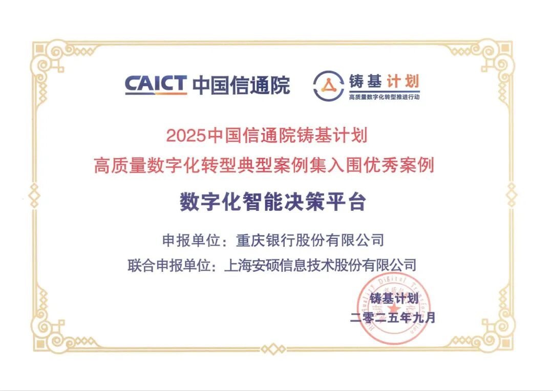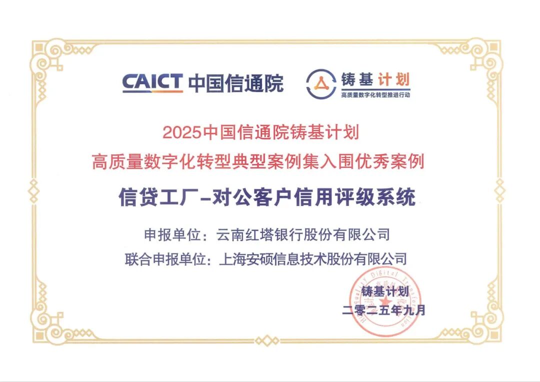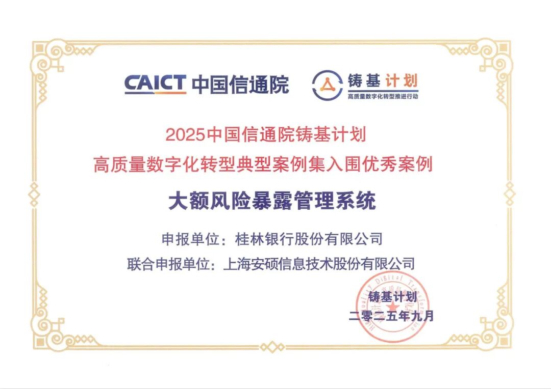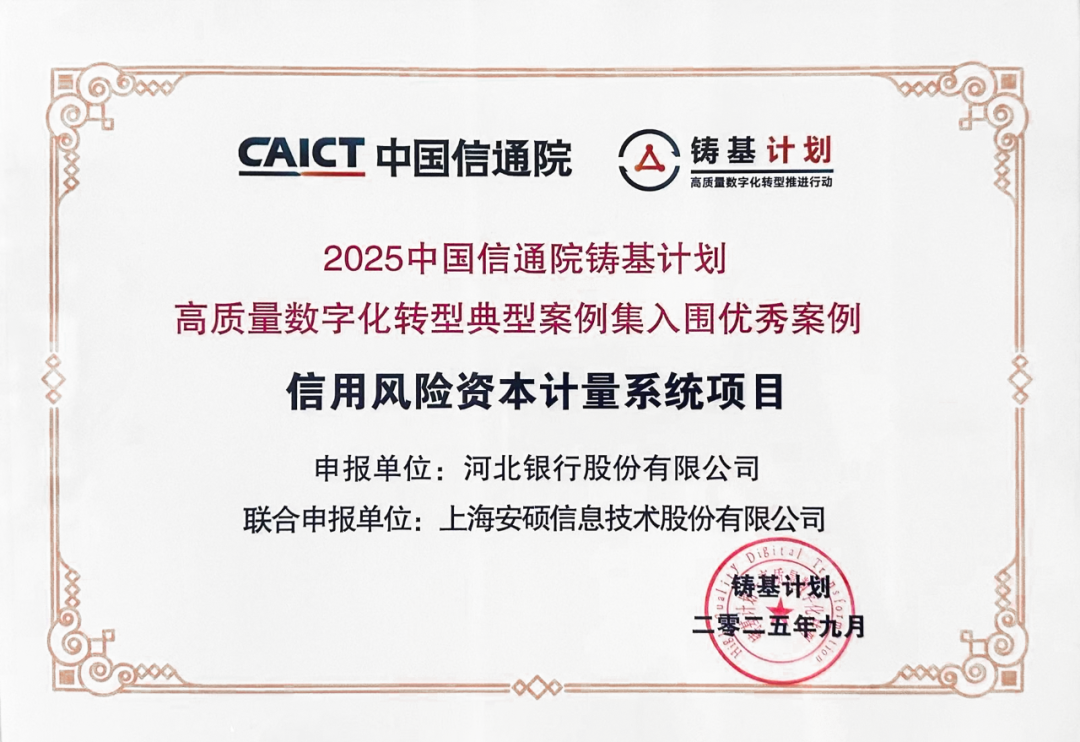 本次大会发布了2025 上半年度“高质量数字化转型产品及服务测评”、2025上半年度“高质量数字化转型案例集入围企业”、“2025上半年度铸基计划技术百人会专家证书”等众多成果。其中由安硕信息实施的河北银行信用风险资本计量系统项目、重庆银行数字化决策平台、云南红塔银行信贷工厂-对公客户信用评级系统、桂林银行大额风险暴露管理系统从近600个参选案例中脱颖而出,成功入围2025中国信通院铸基计划高质量数字化转型优秀案例。
